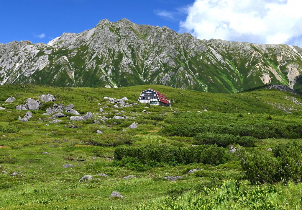 まず小屋の建つロケーションがいい。平の中央、何物にも遮られることなく、凛として佇む姿に魅了される。マンサード屋根の洒落た外観が牧舎チックで、周辺の緑や背後の山とあいまってアルプ的景観が決まっている。そして見た目以上に中身が秀逸。築10年ほどでモダン、展望抜群の階上のベランダ、武骨で素朴ながら木の質感を存分に生かしたお洒落な内装、最奥部とは思えない凝った食事、種類豊富なアルコール提供などなど、登山者心をくすぐる設備とサービスの数々で、人気度の非常に高い小屋になっている。